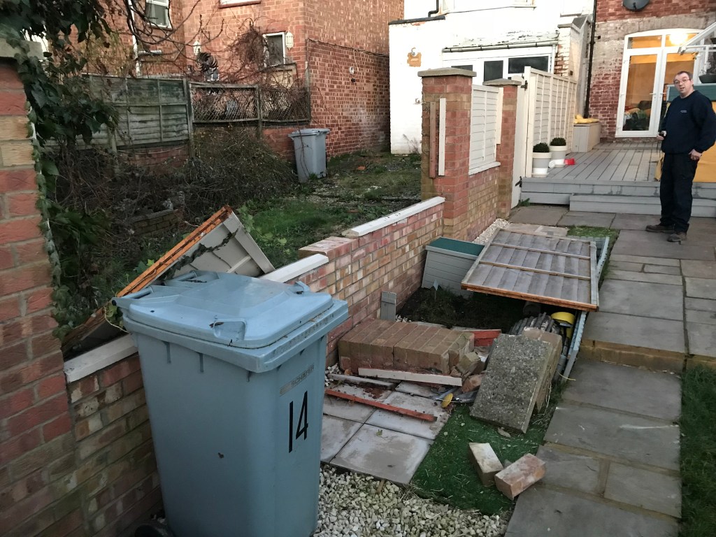 The wind was so strong last Jan that it brought our fence down… as well as our brick wall. We got up to a disaster in our garden. Lots of fellow Ketteringites had fences down, trampolines over-turned and general garden mayhem, but the wind actually blew our wall column down – Andy’s look says it all. Shock!